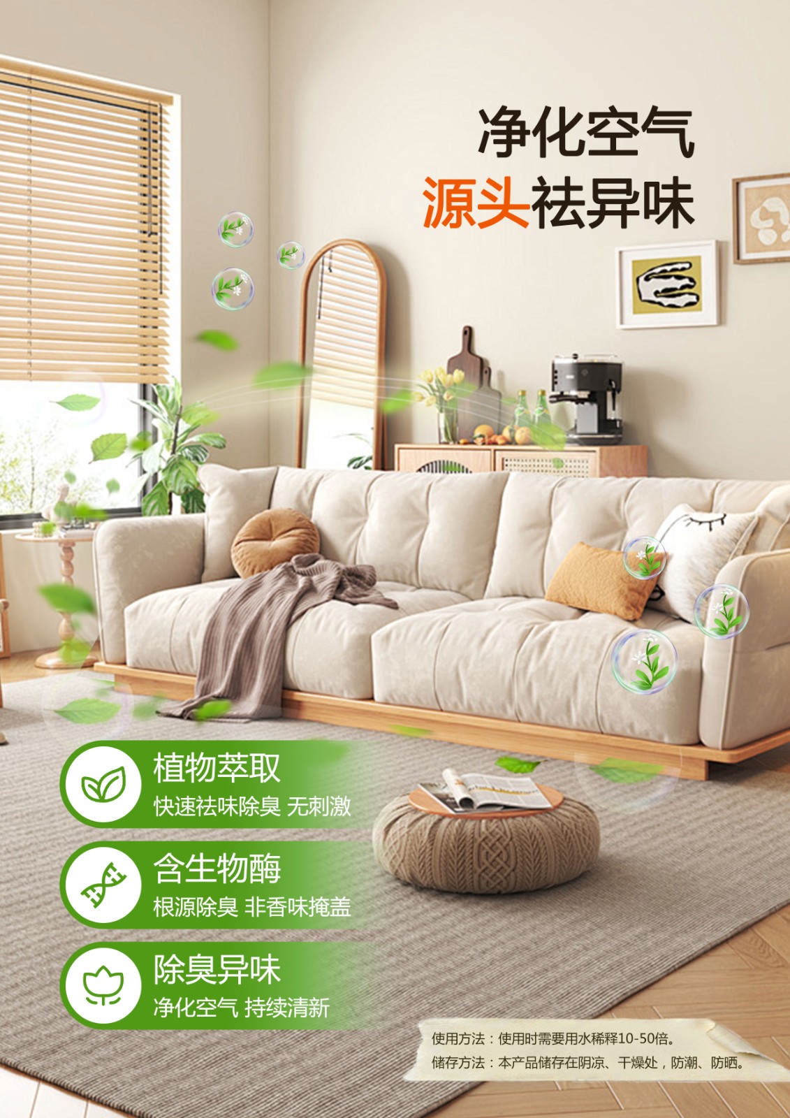 植物萃取活性精油、植物提取活性酶、表面活性剂、去离子水。由植物汁液萃取的活性精油和植物提取的活性酶等物质科学配比而成,具有快速分解异味和抑菌的功效。溶液中的植物活性精油属于小分子精油,具有极强的穿透性,对恶臭因子具有快速捕捉、吸附、中和、分解以及抑制作用。植物活性酶是一种催化剂,可以加速植物活性精油的分解异味的化学反应的速度,又可以处理臭气源头,分解臭源物质的蛋白质和脂质,抑制有害细菌的生长。两者结合可以达到高效、快速、安全地除臭的效果。安全环保无二次污染。