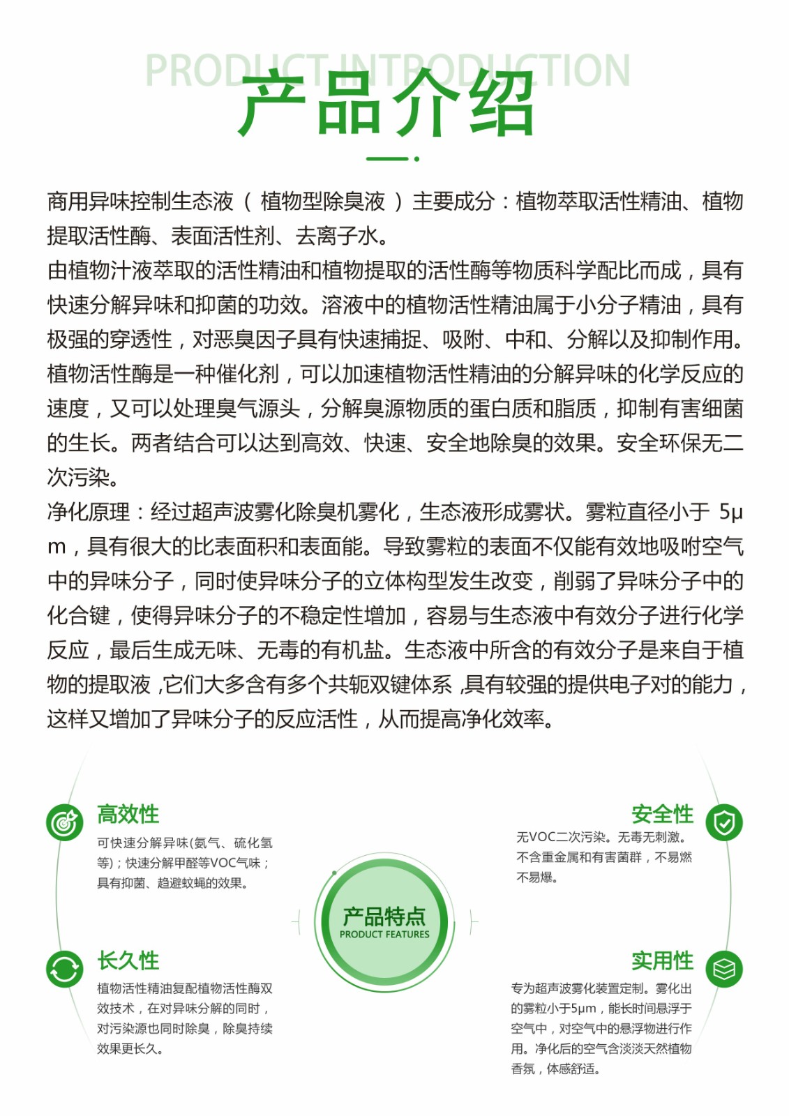 植物萃取活性精油、植物提取活性酶、表面活性剂、去离子水。由植物汁液萃取的活性精油和植物提取的活性酶等物质科学配比而成,具有快速分解异味和抑菌的功效。溶液中的植物活性精油属于小分子精油,具有极强的穿透性,对恶臭因子具有快速捕捉、吸附、中和、分解以及抑制作用。植物活性酶是一种催化剂,可以加速植物活性精油的分解异味的化学反应的速度,又可以处理臭气源头,分解臭源物质的蛋白质和脂质,抑制有害细菌的生长。两者结合可以达到高效、快速、安全地除臭的效果。安全环保无二次污染。