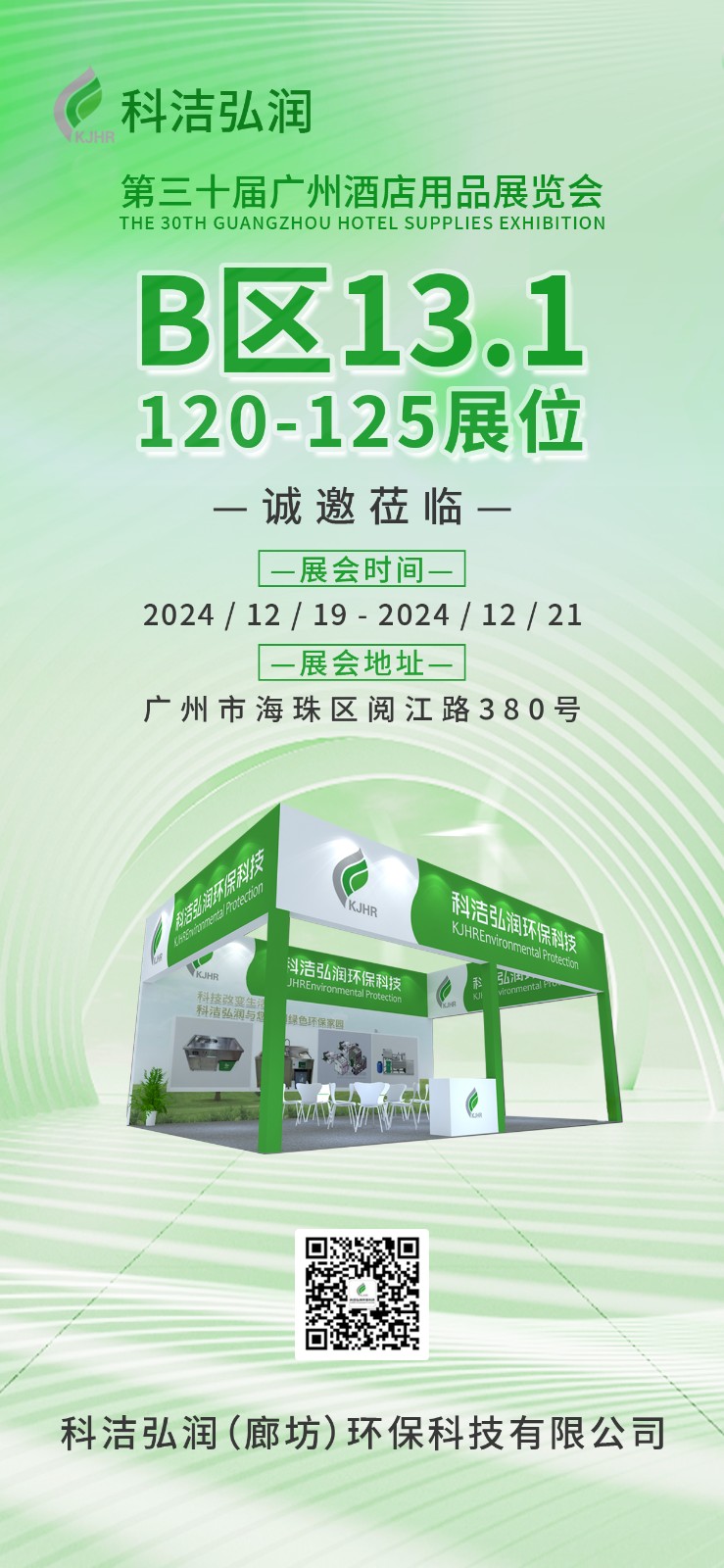 科洁弘润(廊坊)环保科技有限公司在此诚挚地向您发出邀请,我们即将参与于 2024 年 12 月 19 日盛大开幕的第三十届广州酒店用品展览会。在本次展览会上,您将能在 B 区 13.1 120 - 125 展位找到我们的身影。